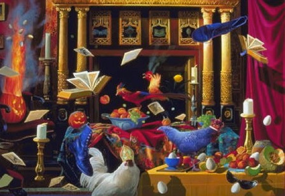 The painting is a magnificent tableaux rendered in the Flemish tradition, with the incorporation of gold leaf and infused with an opaque, jewel-like quality. But it is also a cockamamie, almost surreal depiction of the hen’s inner life.