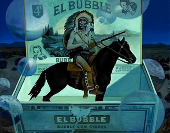 Michael Scott’s thirty-one large and magnificently garish oil paintings, collectively called Farny Fables, are meticulously and lovingly detailed works in which two meanings of fable perfectly dovetail in a highly theatrical, seamless narrative that was inspired, in part, by the life of Henry Farny. Farny (1847-1916) was a successful painter in his own time when there was an eager audience for sentimental depictions of American Indians and Western landscapes. Scott seems to be asking, “What if Farny had painted according to his own core sense of values rather than according to market values? What if he’d been more process oriented rather than product oriented? And so forth.