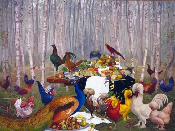 Penny devises a plot to rearrange all the still lifes in museums. She invites all her friends To a banquet to enlist them in her plan. Her mission is opposed by a mysterious organization know as TRA (Twisted Ridiculous Art), which is art spelled backward. “They are not labeled as such, but it is probably suspect that they are curatorial types,“ Mr. Scott says. Birds with brilliant plumage fill every canvas, strutting around tableaus of colorful arrangements of food and flowers. In many of the works food-grapes, pickles, lemons, jalapeno flavored candy corn-flies through the air. Curators, Mr. Scott says, tell other people how to look at art and what to think about it, but he is “trying to suggest an approach that allows people to go into galleries and museums to discover their own creativity in interpreting art.“.