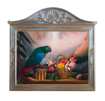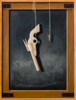 Michael Scott wasn’t always the impish artist he has been of late. Long renowned for his masterful landscapes of the Pacific Northwest and Monhegan Island, Maine, about a dozen years ago he switched gears- actually, he switched his entire mode of transportation. First he came out with two series of oils- fanciful philosophical narratives that used barnyard fowl as foils to explore the nature of art, inspiration, beauty, success, and commerce. Then, in 2006, shortly after relocating from Ohio to his newly built home and studio outside Santa Fe, he began to immerse himself in the rich, risible, irresistible West: it’s history, it’s romance, it’s fantasies and realities. In all three shows, he referenced- pictorially, thematically, metaphorically, and in what is now a signature vivid Technicolor palette- Old Dutch Masters and the great trompe l’oeil painters of the 1800s.
