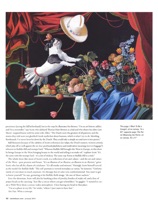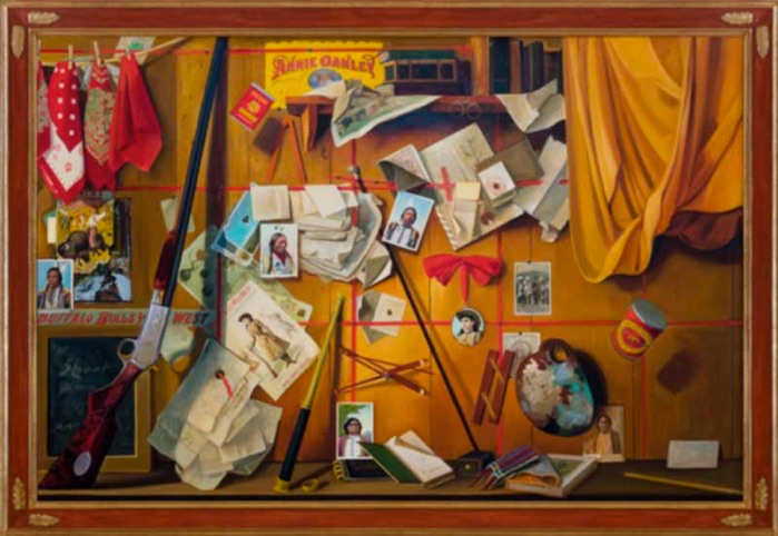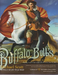 Mischievous as he is, though, Scott’s impish bent in neither shtick nor newfound gimmick. Nor should it imply that just because there’s humor in them thar paintings- and puns and double entendres -his work is lesser than. The humor’s there but it never overrides his seriousness of purpose, his stunning craftsmanship and compositional acumen, or the outright beauty of his images. That’s because his humor isn’t just jokes, it’s informed, intelligent, sophisticated. It’s funny in the vein of Annie Hall, Magritte, and Daniel Defoe, a funny aimed not so much at uncovering the Truth as at posing (poking?) questions- The questions. “This show (Buffalo Bulb’s Wild West Show, June18-July 31 at Gerald Peters) is a conversation about who we are,” explains the affable Kansas-born 58-year old. “Not to be preachy but to ask, Who are we? What’s our place in the world?”