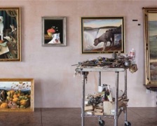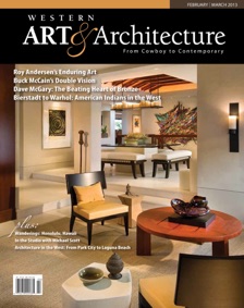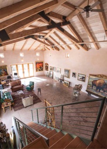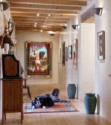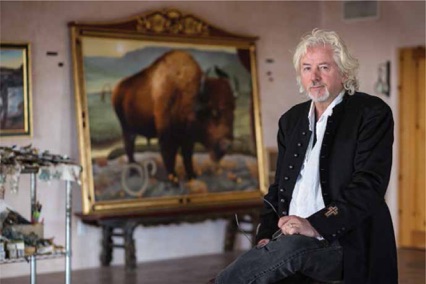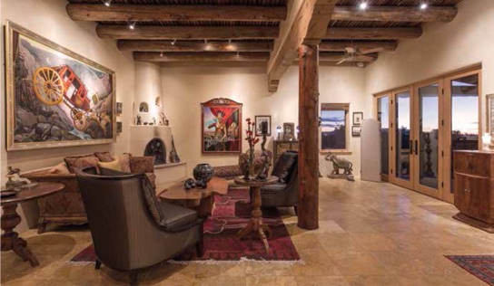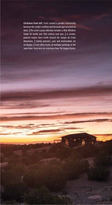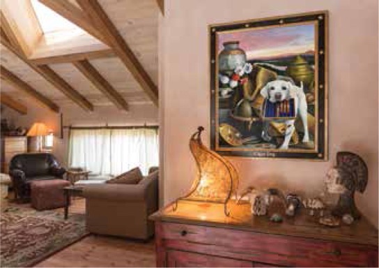 “We’ve had some great dinner parties here with the lights dimmed, candles lit and the food prepared in the entryway kitchen,” says Scott, an accomplished cook. “The space has also functioned well as a dance hall. I can tell you that.” Spilling out from shelves located throughout the space are the props Scott collects that find their way into his canvases: cavalries of tin soldiers, toys from the 1940s and ’50s, miniature animal carvings and consumer packaging and advertising from the late 19th century. “The props provide me with a lightheartedness that allows me to create parody,” Scott says. In a place of honor on a library shelf, sits the El Bubble cigar box that inspired an internal conversation about the difference between value and worth that led to the acclaimed series of paintings, Farny Fables. Perhaps the most stunning aspect of the studio is the 40-by-16-foot western wall. “I wanted my working wall to face west so there was no hot light on the paintings,” Scott explained. “A wall that scale is very demanding. If a painting can hold that wall, it will work in any environment.” Currently covering the wall are selections from Scott’s latest series, The Doggie Diaries, which opened in New York in 2012 at the Gerald Peters Gallery. Based on the conceit that rescue dogs are as good as pedigree dogs and only considered inferior because of misguided perceptions, these canvases feature a romantic but motley crew of canine characters portrayed as drunken sailors, jazz musicians, pirates, starlets and assorted outlaws. All of this adds up to a magical combination of form, function and style — a place where vintage props and a high-desert landscape transform technically adroit paintings into artworks of wonderment. “Magic is what I try to create in life,” Scott says. “There is the magic in the paintings and the enchantment created by a studio filled with outrageous props that forge a simultaneous sense of the present and past. Life in my studio is a kind of magic realism where dogs can sing opera and buffalos can act.”